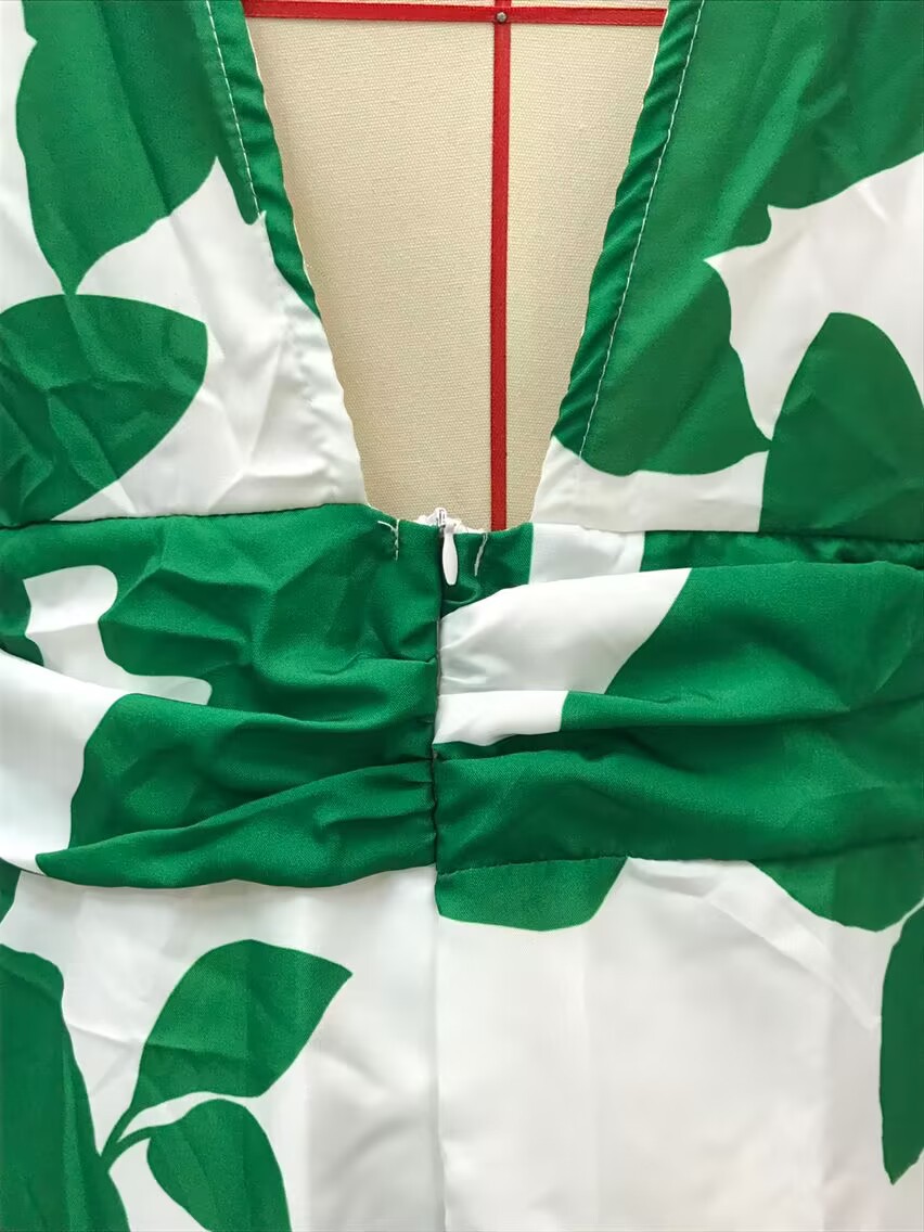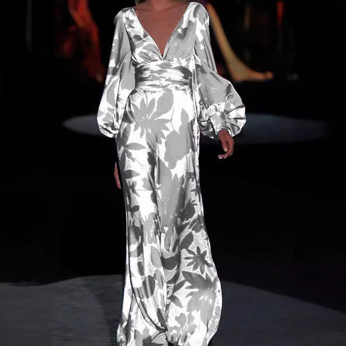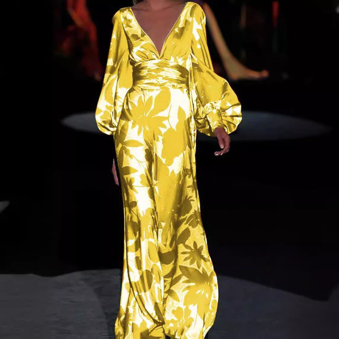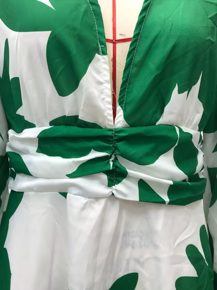 2025 Cross-Border Spring and Summer New European and American Fashion Printed Dress Sexy V Neck Waist Loose Long Skirt