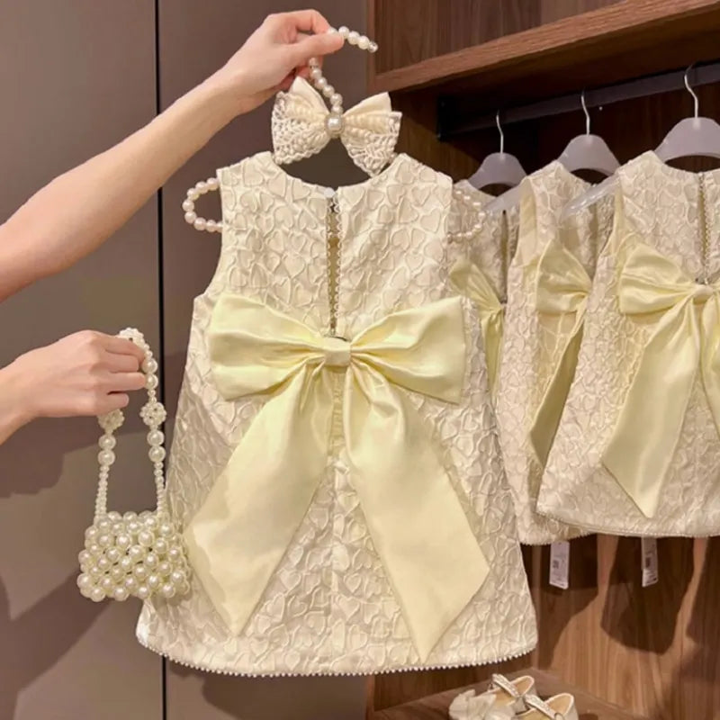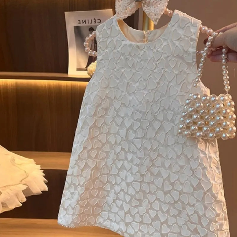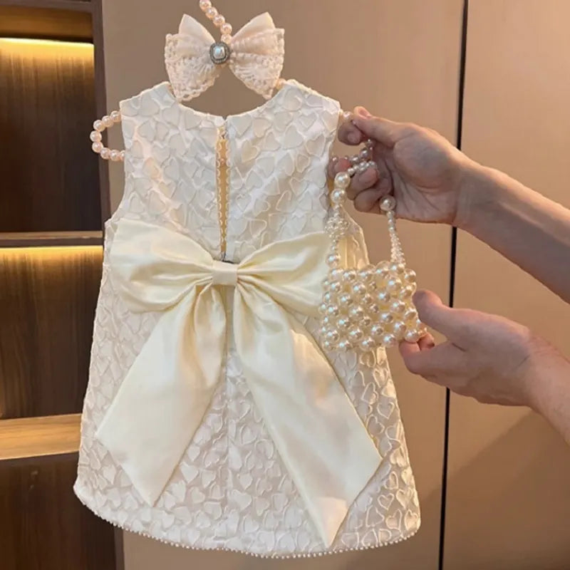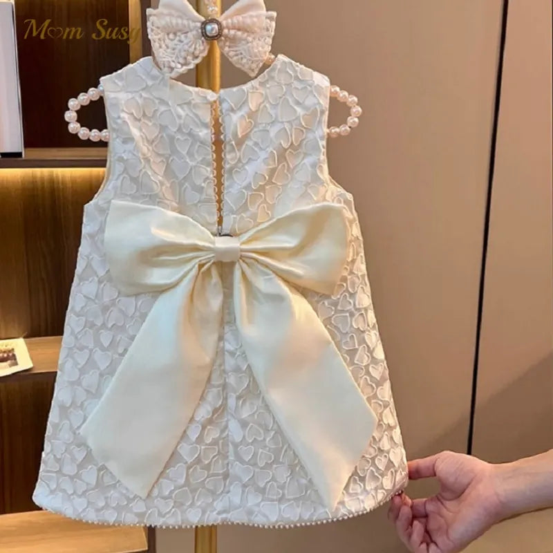 Baby Girl Princess Love Heart Silk Pearl Dress Sleeveless Child Vintage Bow Vestido Party Pageant Birthday Baby Clothes 1-10Y
