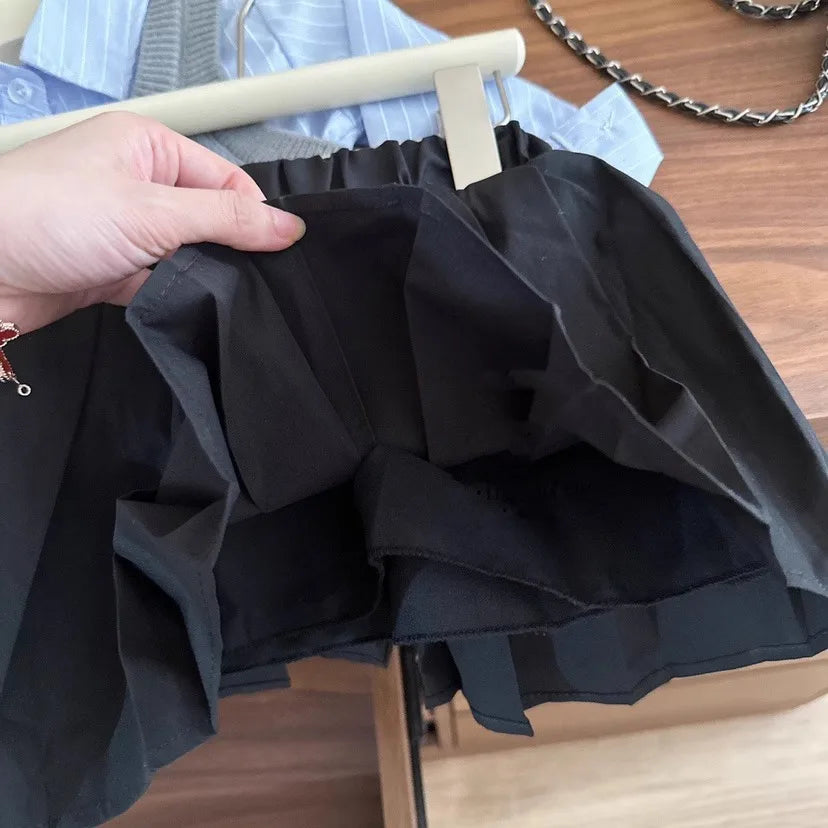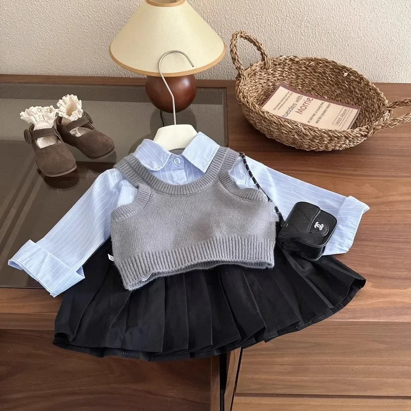 Girl Suit Korean Version of Baby Girl Autumn Knitted Vest Vest Blue Striped Shirt Pleated Skirt Three-piece Set Fashion