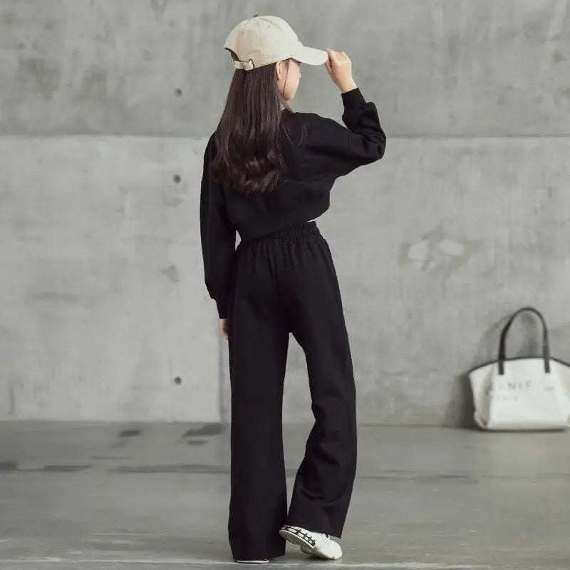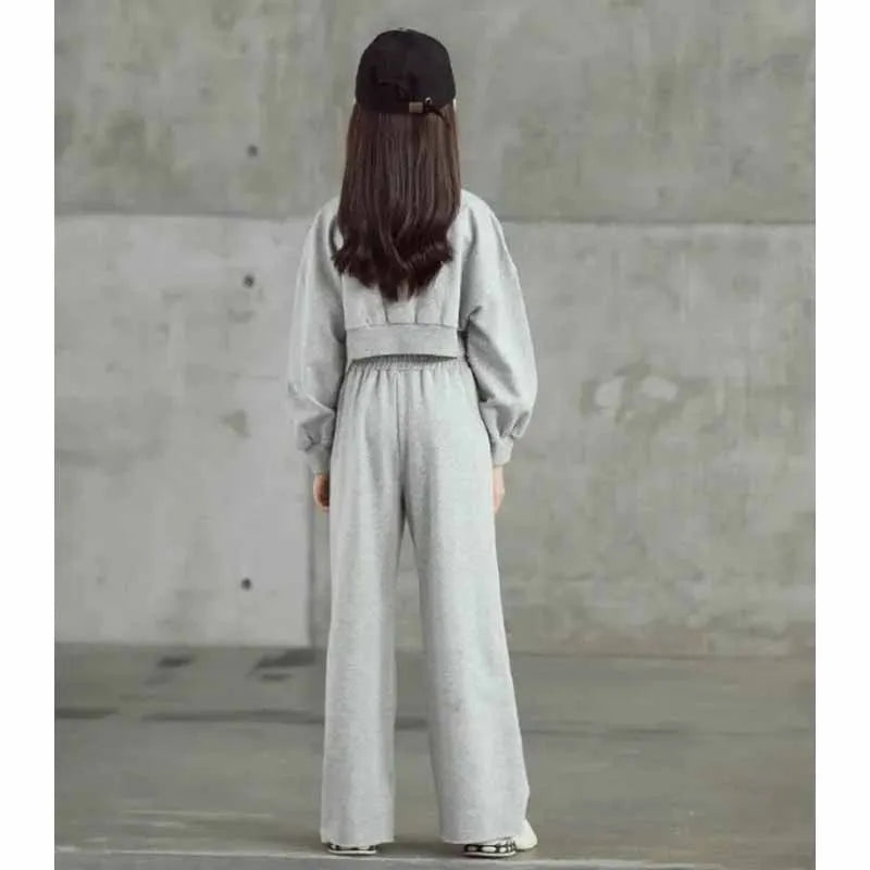 Girls Solid Colour Sets Children's Long-Sleeved Short Sweater Trousers 2Pcs Spring Autumn New Kids Fashion Casual Suit 4-12Y