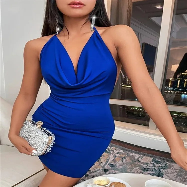 Sexy Mini Dress Lace Up Strap Pure Silod Party Club Elegant Y2K Hang Neck Hollow Backless Straples V Neck Elegant Evening Dresse