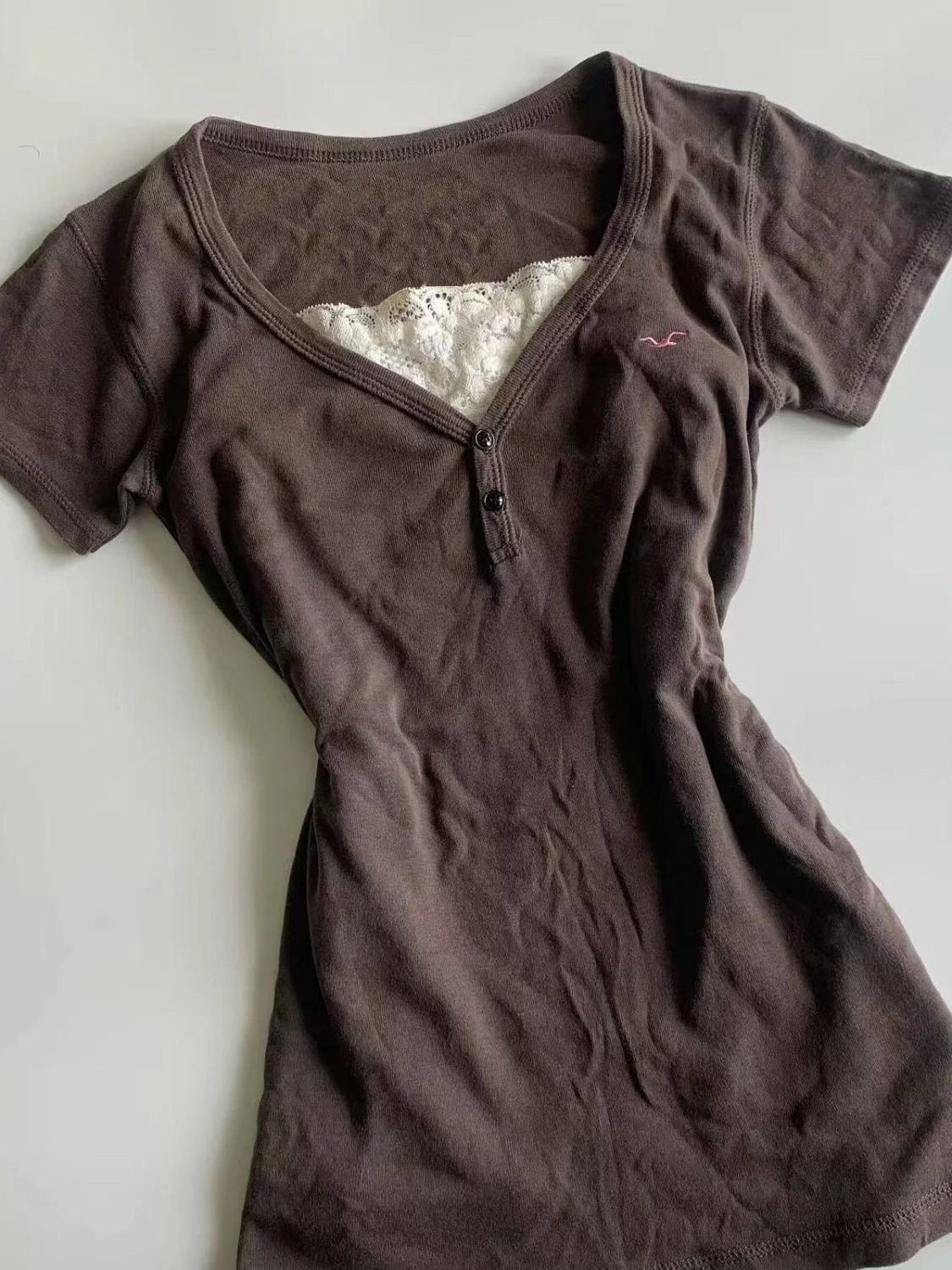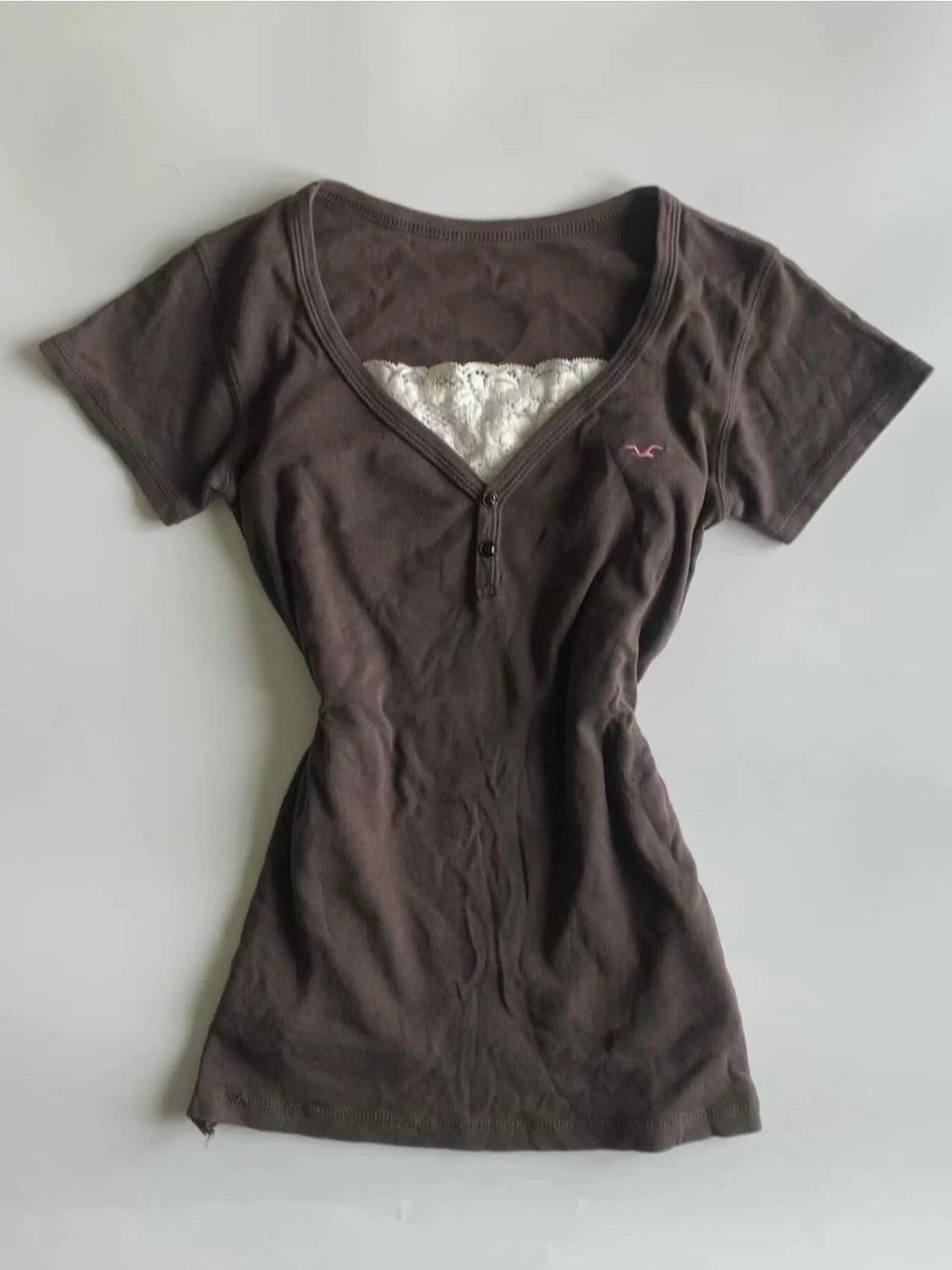 Vintage Fake 2 Piece T-shirt 2000s Punk Lace Slim Aesthetic Harajuku Y2K Woman Crop Top V-neck Summer Chic Retro Fashion Emo Tee