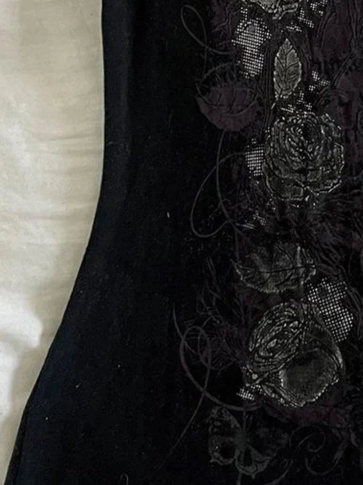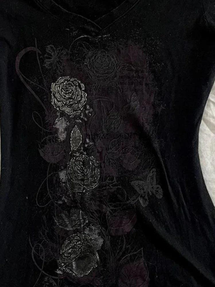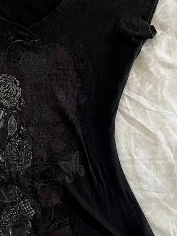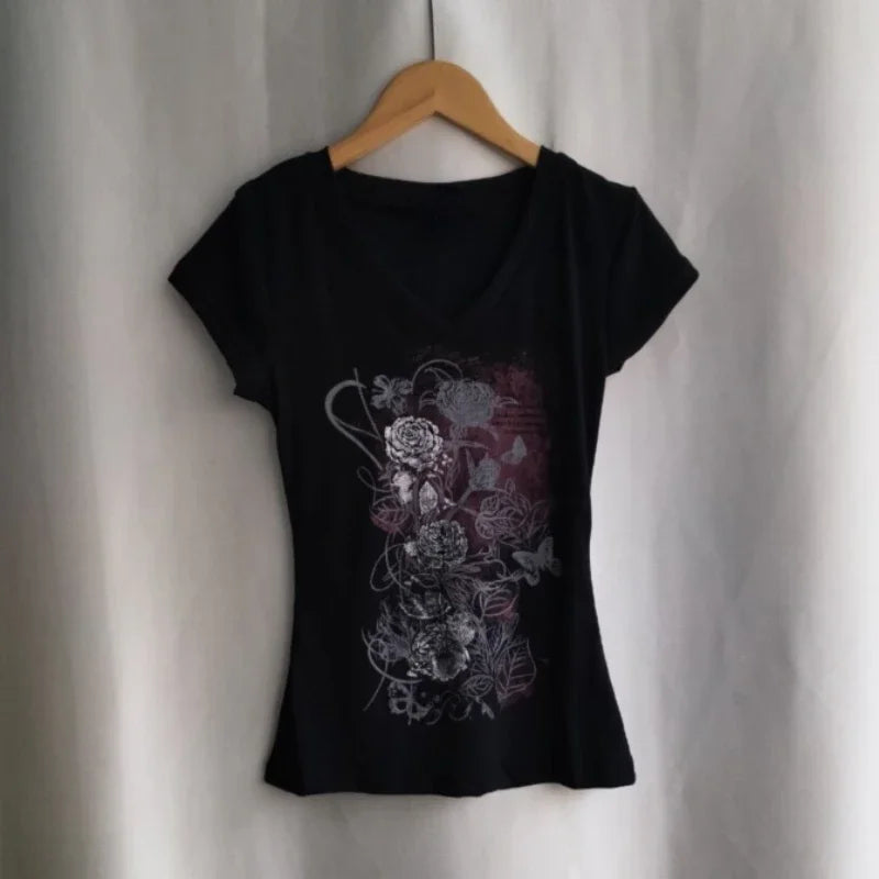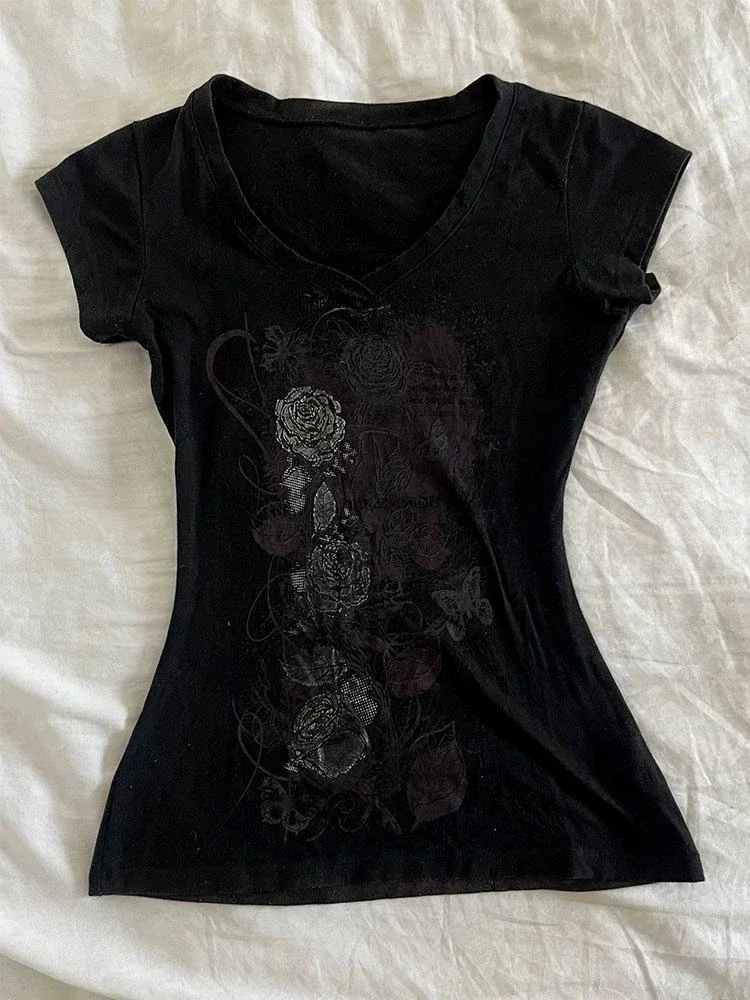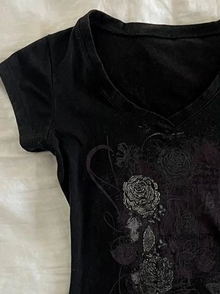 Y2k Aesthetic Flower Printing Women Grunge T-shirts Vintage Slim Harajuku Causal Black Tshirts 2025 Summer Bottoming Crop Tops